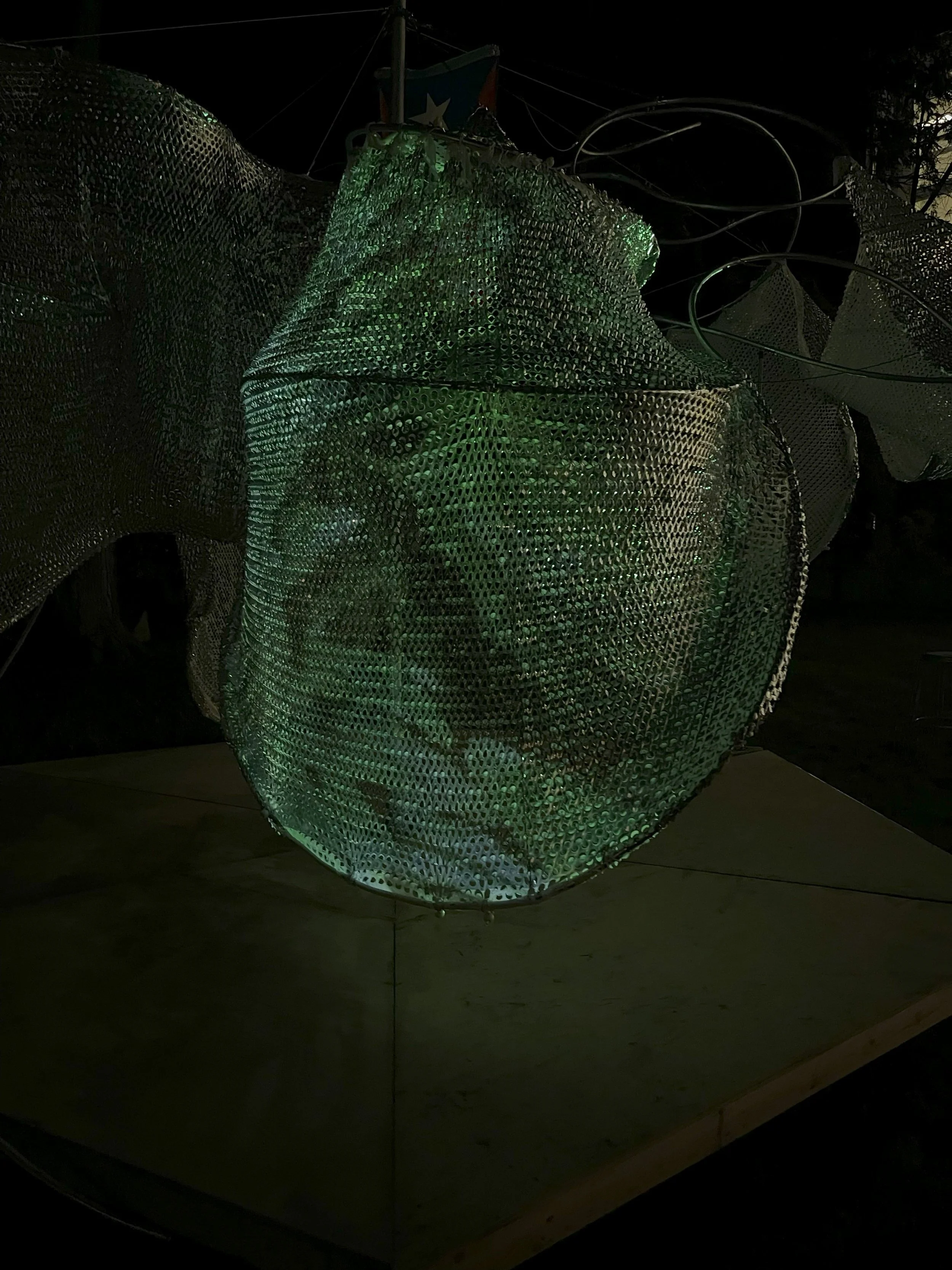 If diasporic populations are never in a permanent form of being but always in a negotiation between absence and presence, then, the regeneration of the community relies on the continual ground-up re-creation of architectural moments and environments that define oases. The Atmospheric Pavilion is a temporary, flexible structure that can be reassembled on different sites. The structure forms a tunnel whose walls are defined by fabric and tinsel, which reflect projections of different waterscapes. The pavilion was informed by the transient nature of urban dislocations and the architectures of diasporas, in order to rearticulate a space of remembrance and regeneration within a city that has always done and undone itself.